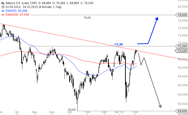 Die Aktie von Adecco näherte sich Mitte Januar 2015 stark dem Tief aus Oktober 2014 an. Knapp darüber drehte der Wert wieder nach oben und zog in den letzten Tagen wieder deutlich an. Aktuell notiert die Aktie an einem Widerstandsbereich zwischen 70,20 und 71,30 CHF.