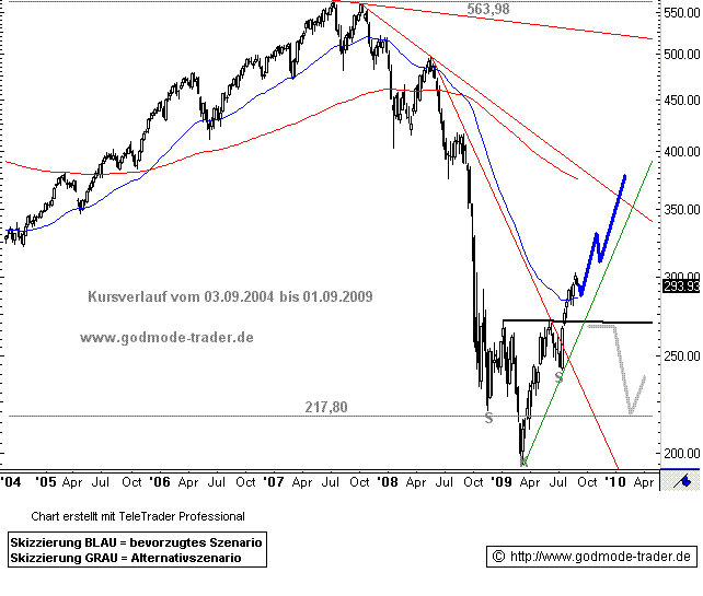 Erst bei 194,99 Punkte konnte der Abverkauf im März 2009 gestoppt werden. Damit bildete der Index den Kopf einer inversen SKS, also einer klassischen Bodenformation aus. Diese Bodenformation wurde mit dem Ausbruch über die Nackenlinie bei damals 270,82 Punkten Mitte Juli 2008 vollendet.