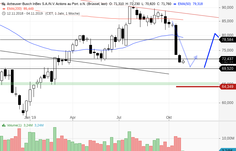 Anfang Oktober stand die Anheuser-Busch-Aktie im Wochenchart knapp unter dem EMA200. Die, in den Wochen davor ausgebildeten Wochenkerzen waren bärisch. Zudem prallten die Wertpapiere an der oberen Trendbegrenzungslinie ab. Daher wurde ein bärisches Szenario mit einer Zielzone bei 72,50/70,00 EUR veröffentlicht. Diese Korrekturzielzone wurde in den vergangenen Tagen erreicht. Das bisherige Verlaufstief liegt bei 70,82 EUR und somit fast genau in der Mitte der Unterstützungszone. Erfolgt in den kommenden Tagen eine größere Gegenbewegung?