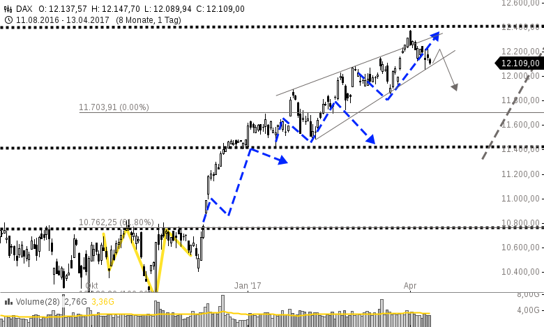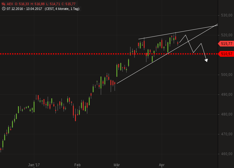 Die französischen Wahlen scheinen ihre Schatten vorauszuwerfen. Am 23. April findet der erste Wahlgang statt, am 07. Mai die finale Stichwahl. Die schweizer Investmentbank Credit Suisse berichtet, dass asiatische Investoren die Wahlen abwarten wollten und sich mit Käufen an den europäischen Börsen zurückhielten. Tatsächlich zeigen Indizes wie DAX, CAC40 (Frankreich), Bel20 (Belgien) und AEX (Niederlande) bärische Keilmuster. S. Prognoseskizzen anbei. Dargestellt sind die regulären Auflösungsmuster aus den Keilen. Die Indizes müßten eigentlich in den kommenden Handelstagen tendenziell eher fallen.