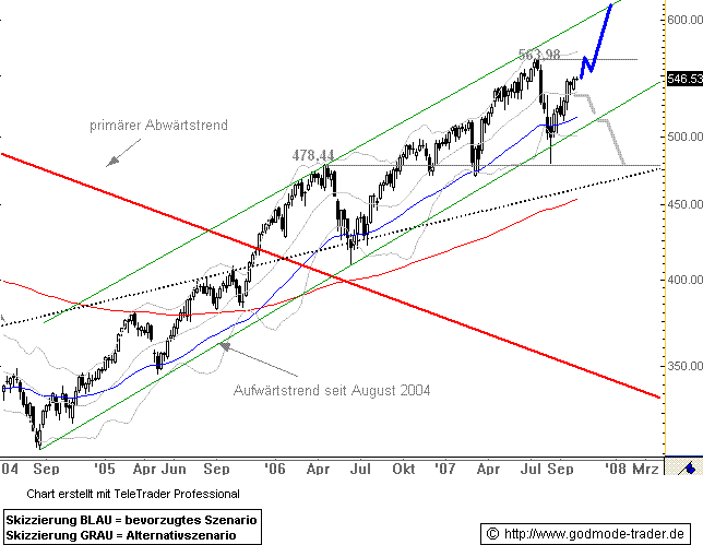 Rückblick: Der niederländische Index AEX erreichte im September 2000 ein Allzeithoch bei 703,18 Punkten. Von dort aus kam es zu einer starken Abwärtsbewegung, welche den Index bis März 2003 auf 217,80 Punkte führte. Von dort aus startete eine Aufwärtsbewegung, die noch immer anhält. Im Dezember 2005 überwand der Index seinen primären Abwärtstrend und zog danach auf 478,44 Punkte an. Nach einem klassischen Pullback an den gebrochenen primären Abwärtstrend kam es zu einer Rallye bis 563,98 Punkte und danach zu einem Rücksetzer auf die wichtige Unterstützung bei 478,44 Punkte. Dieser Rücksetzer wird seit Mitte August 2007 gekauft, nachdem es sogar zu einem kurzzeitigen Bruch des Aufwärtstrends seit August 2004 kam.