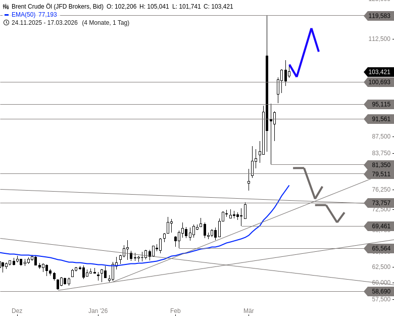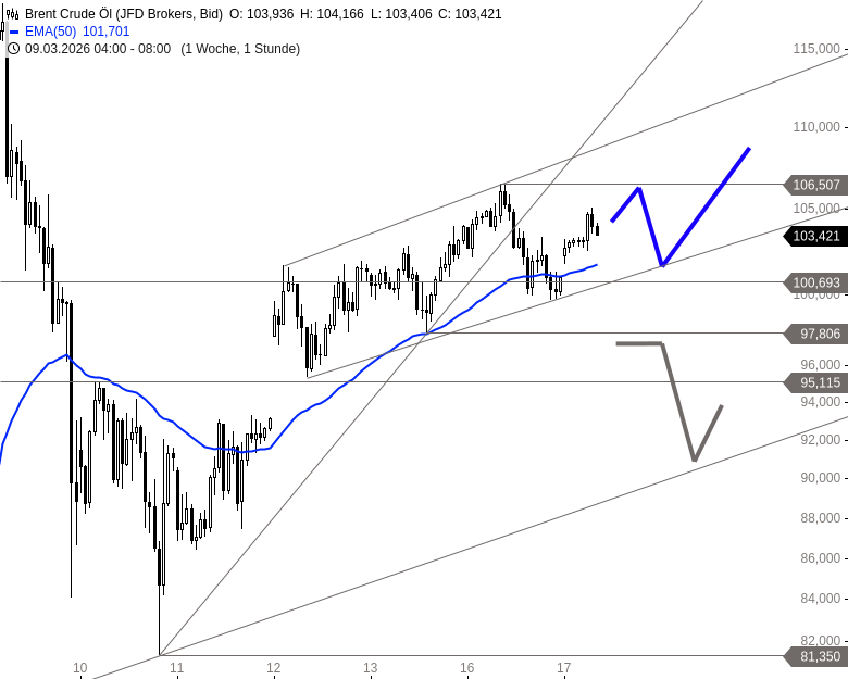 Intraday bildet sich aktuell ein enger Trendkanal, innerhalb dessen Brent weiter ansteigen könnte. Zunächst besteht Spielraum bis 106,50 USD. Gelingt ein Ausbruch darüber, könnten auch 109,18 USD wieder erreicht werden. Auf der Unterseite bleibt die Marke von 100,69 USD entscheidend. Ein Rückfall darunter und damit ein Bruch des Aufwärtstrends könnte eine Konsolidierung bis 97,80 USD und darüber hinaus bis 95,12 USD einleiten.