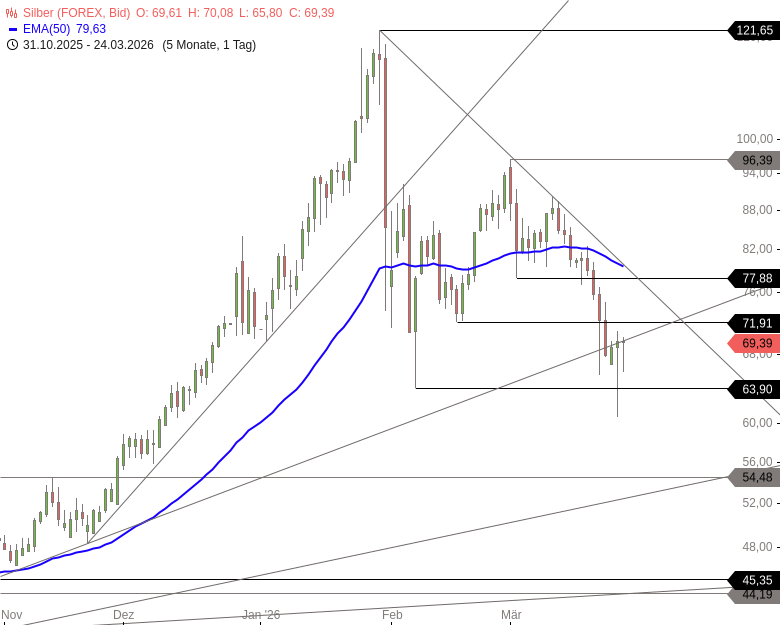 Nach einer Zwischenerholung bis 96,39 USD rutschte Silber in den vergangenen Wochen wieder deutlich ab. Die Abwärtsbewegung verschärfte sich zu Wochenbeginn nochmals und führte die Notierungen zwischenzeitlich unter die Marke von 63,90 USD. Im weiteren Handelsverlauf setzte jedoch ein bullisches Reversal ein, wodurch sich der Kurs stabilisieren konnte.