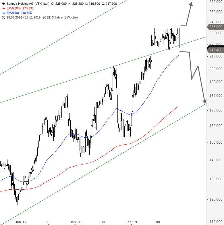 Die Aktie der Sonova Holding startete nach einem Tief bei 57,30 CHF aus dem August 2011 zu einer starken Rally. Im September 2014 markierte sie in erstes Zwischenhoch bei 153,70 CHF. Danach nahm die Dynamik der Rally deutlich ab. Im Mai 2019 gelang allerdings der Ausbruch über eine obere Pullbacklinie. Anschließend kletterte der Wert auf ein Hoch bei 236,00 CHF. Seit diesem Hoch aus dem Juni 2019 befindet sich die Aktie in einer Schiebezone zwischen 236,00 CHF und 215,40 CHF. Dabei behauptete sich der Wert bisher über der alten oberen Pullbacklinie. In dieser Woche gab es sogar einen Ausbruchsversuch über 236,00 CHF, aber offenbar misslingt dieser.