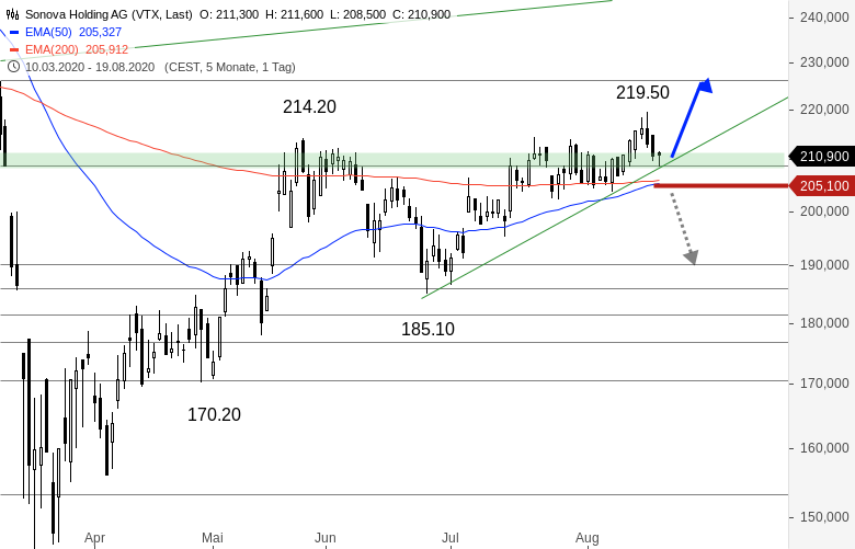 Fallen die Wertpapiere in dieser Woche unter die 204.00 CHF-Marke zurück, dann würde ein schwaches Verkaufssignal erfolgen. Das Ziel aus diesem Handelssignal liegt bei rund 190.00 CHF. Würden die Wertpapiere anschließend sogar unter 185.00 CHF fallen, müsste man mit Kurszielen um 170.00 CHF rechnen.