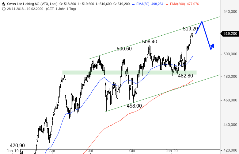 Die Aktien von Swiss Life Holding setzten ihre Rekordfahrt in den vergangenen Tagen weiter fort und markierten Anfang dieser Woche bei CHF 519.20 ein neues Allzeithoch. Der Schlüssel für dieses Allzeithoch war ein Anstieg über den kurzfristigen Abwärtstrend. Dafür waren Kurse über der 500,00 CHF-Marke nötig. Anschließend folgte zwar noch ein weiterer Test der markanten Unterstützungszone bei CHF 480.00, doch der langfristige Aufwärtstrend war zu keiner Zeit in Gefahr.