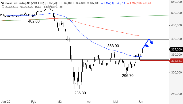 Der Ausverkauf bei den Aktien von Swiss Life Holding stoppte im März bei 256,30 CHF. Dort griffen die Bullen verstärkt zu und der Titel konnte sich relativ rasch wieder über der 300,00 CHF-Marke erholen. Im April nahm die Volatilität stärker ab, aber der Wert markierte trotzdem bei 363,90 CHF ein Zwischenhoch. Dieses Zwischenhoch lag exakt am EMA50 im Tageschart. Anschließend fiel der Titel allerdings temporär unter die 300,00 CHF Marke zurück. Von diesem Tief aus bei 296,70 CHF startete die aktuelle Erholungsbewegung. Dieses Mal reichte die Kraft der Bullen aus, um den EMA50 zu überwinden. Doch nun braucht der Titel weiteres Aufwärts-Momentum.