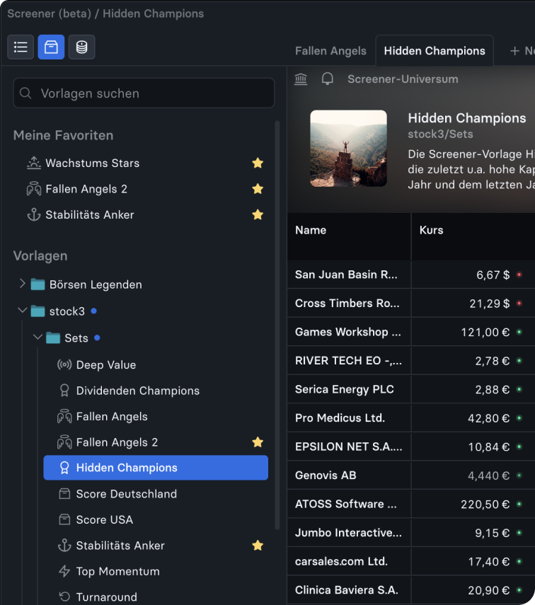 Wir haben zahlreichen Vorlagen und Filter für Dich voreingestellt, damit Du mit interessanten Screenings in die Aktienanalyse gehen kannst. Du kannst Dir natürlich auch eigene Filter und Vorlagen erstellen.