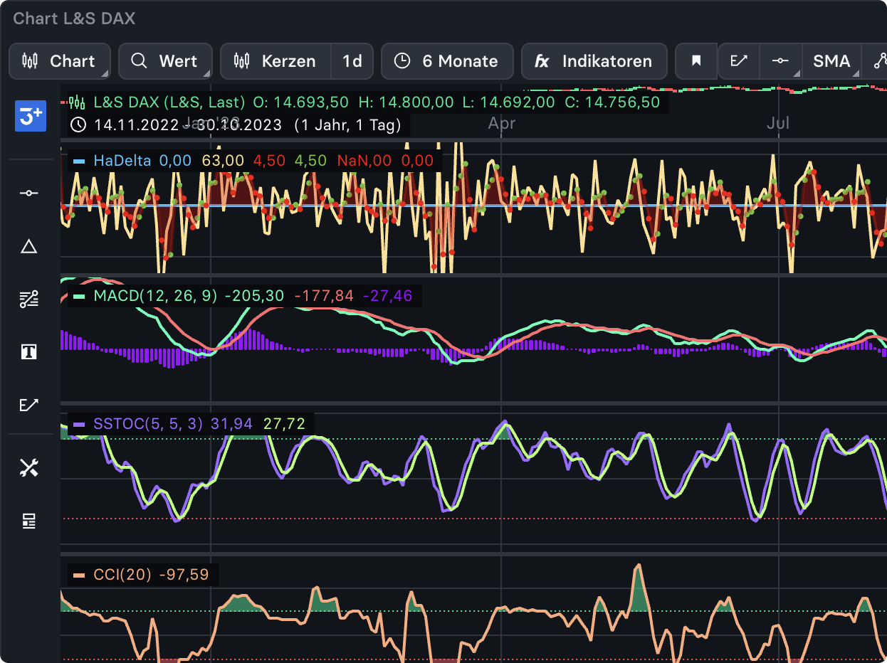 Verwende verschiedene Indikatoren und zahlreiche professionelle Werkzeuge für Deine Analysen. Lass Dir die Kurse als Kerzen, Linien, Point & Figure uvm. anzeigen. Setze Dir Kursalarme. Lege eigene Zeitintervalle und Zeiträume fest. Das Ziel: die bestmögliche Handelsentscheidung zu treffen.